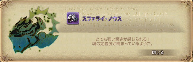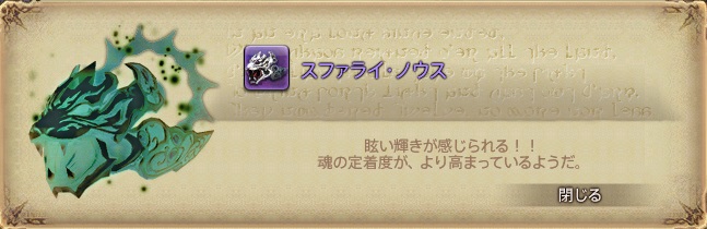 んで、1層クリアした時の報酬は・・・なんだっけ?? まぁハイアラ装備やアクセは無かったなぁ・・・タンク用じゃないのだけ覚えてるw そしてボスからスタートだったので序盤の雑魚処理してない。 つまり! そう!! 1層踏破のアチブ開放ならず・・・orz 外に出てから気づいたよ・・・もう!もう!ヽ(o`Д´o)ノ で、その時のPTで初見2層へとなだれ込み、簡単な説明だけして突撃! そして、撃沈! これが確か土曜日?の話。 ほんでもって今日(10/5)。 お昼近くに2層PTがあったのでやる事は長女でMT/OTともに理解していたので参加。 それもOT。 ウヒィーと思いつつもやってみましたけどそれほど難しいもんでもなかったです。 ただ序盤80%の時に沸くラミアのタゲ取りがめんどいかなぁ~と思いましたけど、 数をこなすうちに『MTよりもこっちが楽なんじゃないか??』と感じてきました(`ω´) ラミアと声さえこなせばあとはDPSどもの仕事ですからOTのへっぽこナイトの火力なんて微々たる物ですし、 ラミアのタゲ取りで結構TPが減っちゃうのでやることやったら休憩してましたw もちろんTP回復すればメリジューヌの削りには参加してましたお(*´ω`)ノ んでまぁ、結構な全滅回数を重ねていってこれでラストってところでようやく2層クリア。 今回のPTでタンク装備希望が私だけだったのでワクワクしてあけてみたら・・・、ヒーラーコートとレンジャーアクセ・・・おぉう・・・ヽ(;´Д`)ノ 私の取れるものはなく装備とってない人だけで石・砂・油のロットを開始。 まずは砂。 私のロット・・・・『4』Σ(゚Д゚;≡;゚д゚) ナイワー、絶対に取れないwww もちろん取れませんでしたよww 次に油。 私のロット・・・・『76(たぶんw)』すっげぇ微妙w 結果は・・・もちろん取れませんでしたよ!ww 最後に石。 私のロット・・・・『80』まさか・・・。 戦利品がカバンへ入ってきましたよwww もう!もう!これで石3個目だよ!戦記まだ貯まってないよ! どうしろというのかねヽ(;´Д`)ノ とりあえず1個はナイト用にブルドガング取るつもりだけど、あとの2個どうしようかなぁ・・・。 というか何気に次女の侵攻編が長女に追いついてきた・・・w さて、3層マクロの準備と練習PTに潜り込まねば(`ω´) 2014.09.29 Mon 19:11:37 ネクサス完成への道-終ということで、残り半分になりまして金曜日(9/26)の深夜から土曜日(9/27)の早朝にかけて真ガル周回してました。 んで、深夜の3時半ごろにまず6段階目にw そしてそこから大体100P分稼いで就寝(`ω´) 起きて一通りの用事を済ませてからはまたひたすら蛮神の周回。 土曜日(9/27)のお昼ごろに7段階目。 ほんで、若干の休憩をちょこちょこと挟みつつその日の18時?19時?ぐらいに8段階目に(`ω´) その後はまた晩御飯やらバハの固定でキャッキャウフフと遊んでその後にまた蛮神周回。 しかし、4層の練習で気力がなくなり早々に就寝ww そして昨日(9/28)の朝10時ごろにやっと9段階目。 で、その日の夕方18~19時ごろだったかな? ついにこの表示がでまして、 さっそくおっさんの所へ行ってノウスを強化! 出来上がりました!スファライ・ネクサス!! どうですか、このドリル感wwww スファライの周りにある輪がすっごい回ってますww そろそろ見た目が変形とかしても良いような気がします。 そしてサブステはというと、 もちろん意思クリ特化型でございます(`ω´) 最初は意思命中もアリかなぁと思ったんですが命中は他の装備で何とかすれば良いし、 最悪食事という手もあるので結局この意思クリ特化型になりました。 とまぁ、なんとか今月中にネクサスが完成しましたヽ( ´¬`)ノワ~イ ただ今までのZWクエと比べると比較的楽な部類になるんじゃないかな?? なんせ、蓄積度たったの2000P貯めるだけ。 それ以外にやることはないので若干拍子抜けというかなんというか。 この分だとパッチ2.4には次のZWクエが実装されそうな気がしなくもないです。 2014.09.25 Thu 23:34:40 ネクサス完成への道-42014.09.24 Wed 22:22:11 ネクサス完成への道-参 |