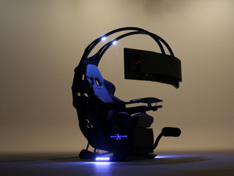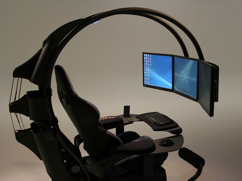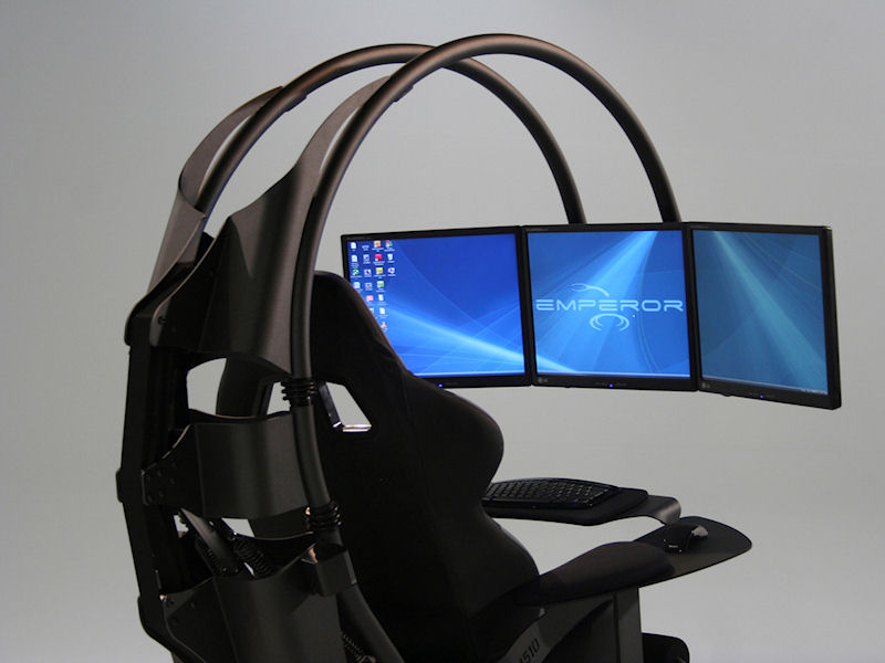 かつ椅子の背後から前面に弧を描くように3台までのディスプレイを装着できるアームの付いた一体型のPCチェア。