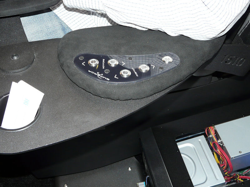 フットレスト付きのシートのほか、左右のアームレストの部分にキーボードやマウスを置くテーブルがあり、