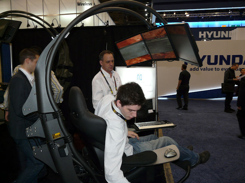 見た目や使用感は、飛行機のビジネスシートにディスプレイアームが付いた感じだが、ブラックで統一され、