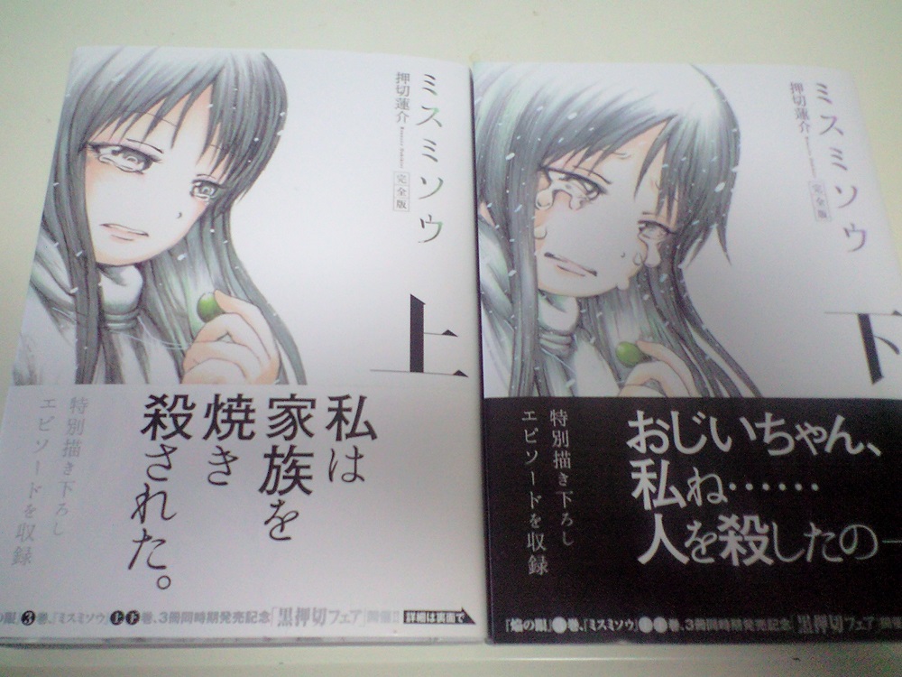 PAGE | 367 366 365 364 363 362 361 360 359 358 357 | ADMIN | WRITE 2013.03.31 Sun 14:58:59 また買ったよ+αまたというかデジカメ強奪事件が発生して数ヶ月・・・いまだに返ってきませんww 携帯での撮影もやっぱり画像が汚いなぁ~と、最新のならそれなりにいいんだろうけど。 ということで新しくデジカメ買いましたw 今回はSONYのDSC-W630という機種。 つぅか、なんだかんだで結局SONY製品で落ち着くんだよなぁ・・・。 実家に置いてるというか放置してるPCやらAV機器もその殆どがSONY製というww 巷で噂のソニータイマーなるものは一切発動もしませんでしたw 一番最初に買ったPCはNEC製でしたけどその次はSONYとMacでしたし、 携帯型音楽プレイヤーもSONY以外は使ったことない。 ミニコンポもSONY製でしたしTVもそう。 でも、SONY信者かといえばそうでもなく・・・。 あ、実家にいた頃で車所持していた時のコンポはSONYじゃなかったはず・・・多分w まぁそんな事はどうでもよくて、今回のデジカメに話を戻しますねw なんでコレにしたのかというと、 4GBのSDHC(クラス6)メモリーカードが3枚付き! それでお値段6910円也!! 即ポチりましたよえぇ(。+・`ω・´)シャキィーン☆ んで早速試し撮りしてみました。 まずは今まで使ってた携帯カメラでの撮影 次に今回買ったデジカメでの撮影 やっぱり画素数が違うんで携帯カメラの方が粗が目立ちます。 まぁでもある程度まで画像サイズを小さくすればそれほど見分けがつかなくなるかもしれません。 で、ついでにこの漫画もご紹介。 この『ミスミソウ』という漫画、はっきり言って後味ものすごく悪いです。 今までそれなりに漫画を読んできましたけどここまで気分が悪くなる漫画はお目にかかったことはありません。 伊達にキャッチコピーが 『精神破壊(メンチサイド)ホラー』 というのも頷けます、それほど人間が怖いと思える作品ですね。 一応この漫画の根底にあるのが「いじめ」というか「人間が作り出す恐怖」らしいです。 あとグロ描写もあります、そっちが受け付けない人はまず読まない方が身の為ですね。 これを描いてる押切蓮介氏の他の作品だと「ハイスコアガール」あとは「でろでろ」かな。 まぁ作風自体がちょっとクセがあるんでやっぱり選り好みがあるかもしれない。 まぁそんなんであまり薦められないのですが、 もし! もし仮に!! 興味があれば一度読んでみてはいかがでしょうか? PR CommentsComment Form |