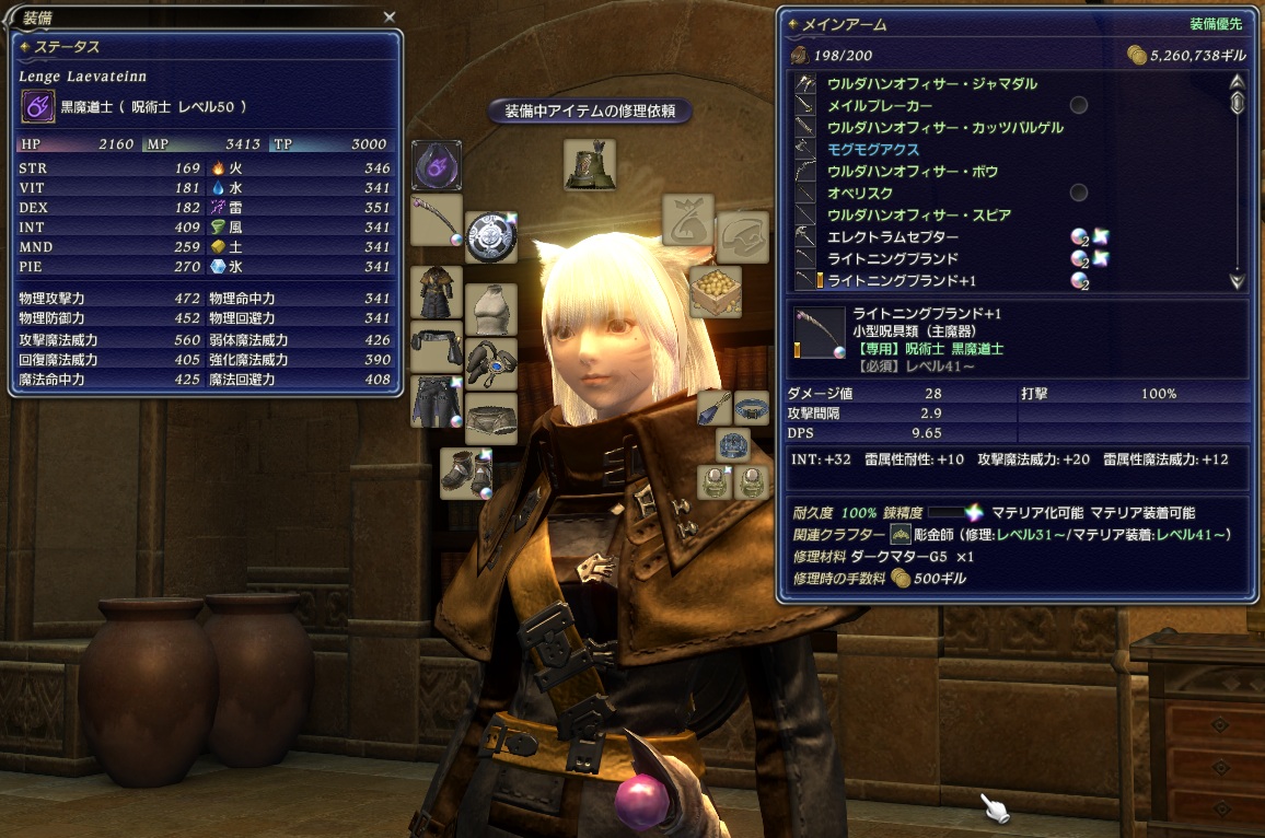 今日はちょと遅めの出勤になりましたのでこの時間に更新しているれんげでございます(*´ω`*) ここ最近、朝晩ホント肌寒くなってきました。 季節の変わり目は体調を崩しやすいので気をつけていきましょう(*>ω<*) まぁ私は早速体調を崩してしまいましたがwwww んで、今日はというといつもオーラムやカッターに行く時は 黒魔導士(オーラムの時はモルボルでモンク)になるのですが、 その際の装備をちょと色々考えております(*>ω<*) 今私の黒装備は、 主:ライトニングブランド+1(INT+32 知力ガガ禁断) 盾:ウォーロックバックラー 頭:ウルダハンオフィサー・キャップ 胴:ウルダハンオフィサー・コート 手:ミリシアリングバンド 腰:ミリシアベルト 脚:コロセウムロインクロス(INT+16 PIE+16 賢人ガガ禁断) 足:マホガニーバッテン[BR](攻撃魔法威力+18 魔軍ダダ禁断) 耳:メイジイヤリング 首:ウルダハンサージェント・チョーカー 腕:ウルダハンサージェント・ブレスレット 右指:ジルコンリング+1 左指:ジルコンリング+1 こんな感じなんですよねぇ(*´ω`*) 主にINTに特化した装備で揃えてみたんですけど、これだと魔法命中力(以下、魔命) が結構下がっちゃってレジられる。 それじゃPTメンバーに申し訳ないので、ここで食事補正をかけたいのですけど さてそれじゃ何を食べれば一番良いのか? んで、まぁ魔命ついでにINTも稼げれば問題ないので自分なりに調べたんですけど 候補として上がるのがやっぱりこの二つ。 ラプトルシチュー キノコのキャベツ巻き とりあえず、まず素のステータスを見てください。 これサンクション前のステータスになります。 レイドに行く時は必ずサンクションを受けてから行きますので、 サンクションをするとオフィサーキャップのINTが+40付加。 それにオフィサーコートの魔法命中力+15が付加されているのがわかります。 そしてここに食事補正をかけると・・・、 キノコのキャベツ巻きを食べると、 INT402→407に魔法命中力425→455へ。 で、INTが上がったのでそれに伴い攻撃魔法威力が1上がって527→528へ。 ほぅほぅ結構いい数字になってます(*>ω<*) で、こっちはラプトルシチューを食べた後ですね。 INTが402→408、魔法命中力が425→448。 こちらもINT上がってるので攻撃魔法威力が527→528になってます。 いつも私がレイド行く時まわりの黒の人は結構な比率でシチュー食べてます。 で、私も真似してシチュー食べようかな~と思いましたけど、 『いやちょと待て!私の場合は人と同じでいいのかな?』と で、こうやって調べてみたんですがふむなるほど。 私は今の装備だとキノコのキャベツ巻きが良いようですね~(*´ω`*) 魔命がシチューよりも+30上がるならこっちがいいみたい? 食事した時のメッセージで上限まで引き出せたか分かるんだけど、 キノコのキャベツ巻きを食べると・・・ ラプトルシチューだと・・・ nWikiによるとこの場合、キノコのキャベツ巻きは上限値の80%以上能力が上昇。 ラプトルシチューだと ほぉ~なるほどね。 やっぱり私の場合はキノコのキャベツ巻きが適正っぽいかな~。 まぁ更に魔命欲しければアクセサリーの指輪をレッドコーラルリング+1に変えればいいかな(*´ω`*) ちなみに指輪を片方変えてラプトルシチューを食べると・・・ メッセージは変わらず。 レッドコーラルリング+1だと魔命が+18になるのでINT390、魔命464。 キノコのキャベツ巻きだと・・・ うん、こっちもメッセージは変わらないですね。 INT391で魔命475。 こっちがいいかな~サンクション受けた時のINTとそれほど差が開いてないんですよねぇ~。 この差は頑張ってライトニングブランドにガガガ禁断すればまかなえる開きですもんねぇ。 これもアリだなぁ~(*´ω`*) ついでに両方指輪をレッドコーラルリング+1に変えてラプトルシチューを食べると・・・ メッセージ変わらずw INT372、魔命484。 流石にここまでいくとガガガガ?くらいのライトニングブランドじゃないとムリか?ww キノコのキャベツ巻きを食べると・・・ お! メッセージが変わったw (ほっぺた~で90%以上の上昇ですねww) INTは373、魔命494・・・う~ん、こっちもINTは厳しいなぁww こうなるとINT特化で行くか、もしくはバランス取ってリングをINTと魔命を付けた方がいいのか。 とりあえずラプトルシチューは無しの方向には決まったのであとはアクセサリーをどうするか。 CCなら姫蟻まではレッドコーラル+1を両方装備して、キマイラで片方をジルコンリング+1にするのがベストかな? ん~悩むなぁ~rep取ったほうがいいのかな~あんまりやりたくないんだよなぁ~rep取るのヽ(;´Д`)ノ よし、とりあえず当たらないと意味無いので両方レッドコーラルリングで行こうw 2012.10.02 Tue 06:49:07 贅沢言いたくないけど・・・先週、同じLSメンバーのあしゅさんに誘われてオーラム17TAに行ってきた、