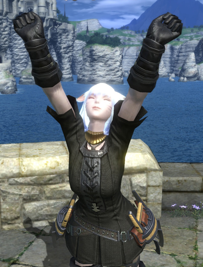 最近は街中と納品する時は決まってこの格好。 装備内容は、 頭:シルバーサークレット(ヘリオドール) 体:レイヴンタバード 腕:スートブラック・ヴァンブレイス 腰:レッドツールベルト 脚:スートブラック・サブリガ+1 靴:アーマード・SBジャックブーツ 主武器:バグナウ 投輪武器:シルバーチャクラム サークレットにサブリガ、それとベルト(汎用装備)に武器以外は格闘士の適正はありませんww でもそんなの(゚ε゚)キニシナイ!! カッコ可愛く見えればそれでいいのです(゚д゚)(。_。)(゚д゚)(。_。) ウンウン のびのび~とアップでもう一枚ww 『リムサは潮風が気持ちいぃ~~♪』 PR TrackbacksTRACKBACK URL : CommentsComment Form |