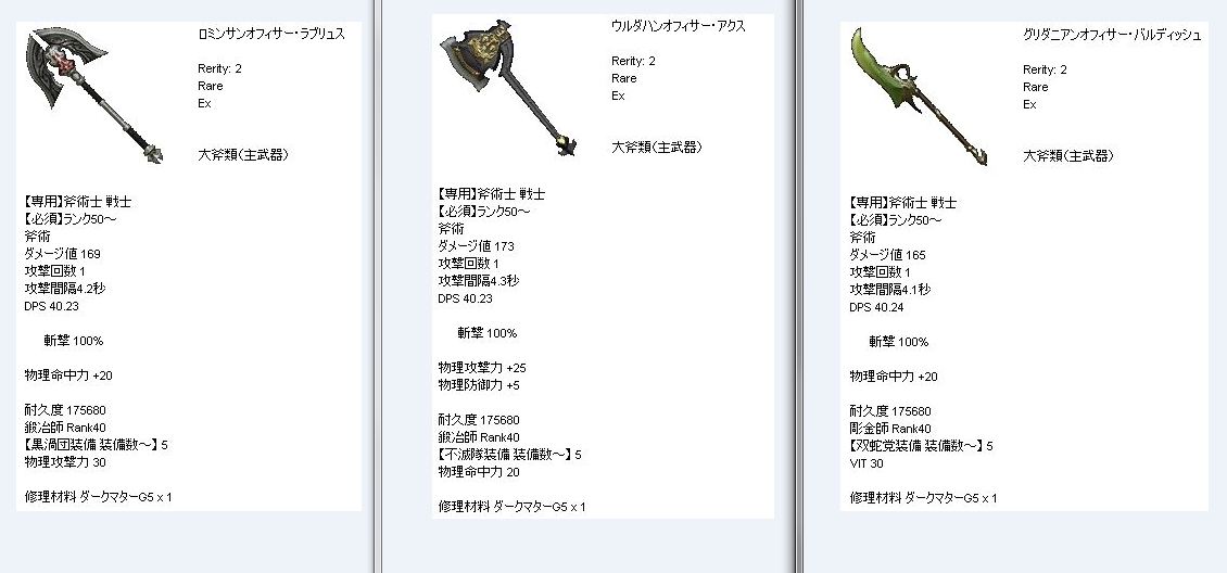 PAGE | 249 248 247 245 244 243 242 241 240 239 238 | ADMIN | WRITE 2012.06.07 Thu 17:36:41 AF武器取得まで?(情報未確定)とその他ようやく斧がカンストしまして戦士のクエストも残すは最後のクエのみ。