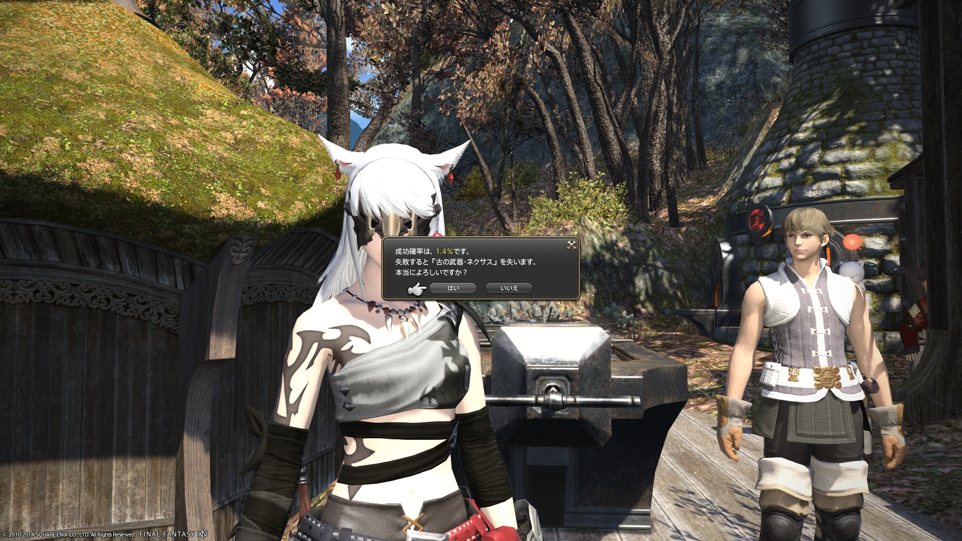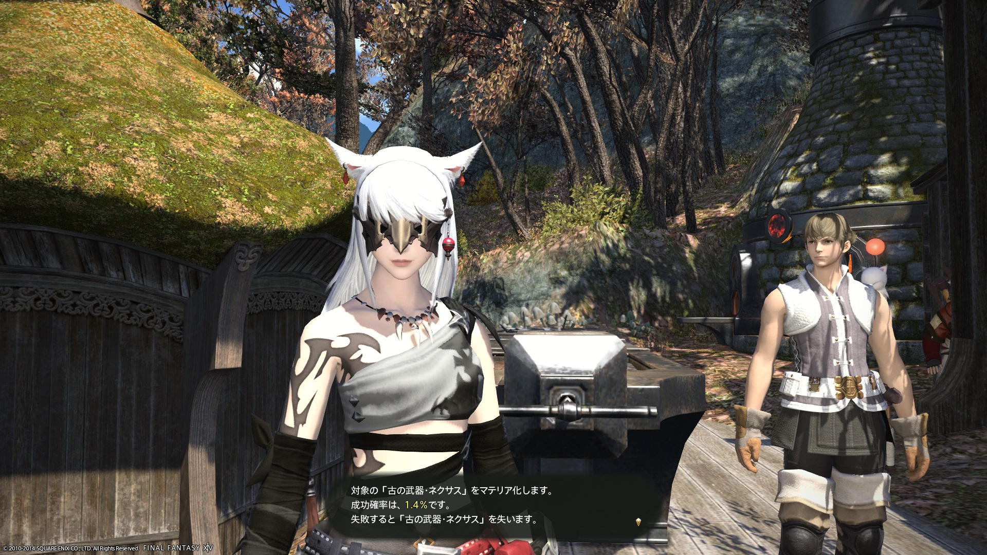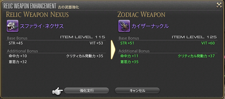 前回の日記から約1ヶ月・・・毎週1個は記事を書こうと思ってましたけどまぁムリでしたなw 今年の初めごろは毎日書いてた?ような?気がしてたんですけどきっと気のせいでしょうね(`ω´) さて、前回から約1ヶ月経ったということはパッチも追加されました。 パッチ2.45。 今回のパッチは主にゾディアックウェポンとエターナルバンドの2本立て。 あとはレターモーグリがちょっと入ってましたね。 私はエタバンの相手もいませんのでさほど興味もなかったんですが、もし私とエタバンしたい人はtellくださいww ということで本題。 今回のゾディアックウェポン(以下ZW)では今までの【古の武器・ネクサス】をZWに形を変えるという内容。 大まかなクエは全部で6つ。 最初の1つめはすぐに終わるんですが、残りの4つが・・・orz そして最後の6つめはまぁお使いクエですねw やり始めて今日ようやく終わりました。 正直ID周回よりも戦記集めがすっごくダルかったですヽ(;´Д`)ノ IDでのアイテムドロップで躓くかなぁと思ったんですがそこまでひどくなかったかと思います。 確か一番周回したのが最初に行ったワンダラーパレスでの12回かな? あとは多くても7回までには出てましたしもちろん1回で終わったIDもあります。 なんか人によっては20回以上行っても出ないとかなんとか・・・ヽ(;´Д`)ノ まぁそういう時は気分を変えて他のIDに行ってみたりした方がいいんじゃないかなぁ~と思います。 私も2~3回行って出ないなぁ~と思ったときは別のIDに行ったりしてちょっと気分を変えてみたりとw そうでもしなきゃ気持ちが続かないwww 一応それぞれのクエまとめ 指定アイテムその1 ・大炎獣の心核(軍票20000x4) ・霊峰の泉水(戦記1600x4) ・ブラスケトル(ハーストミルのよろず屋100000ギル) ・戦神砂(ホワイトプリムのよろず屋100000ギル) ・ブロンズクリスタル(ジジルン交易商店100000ギル) ・アラグの樹脂(忘れられたオアシスのよろず屋100000ギル) 指定アイテムその2 製作アイテムなんですけどマケボでも購入可能、もちろんトレードも可能。 ・秘製イールパイHQ ・上質な古布HQ ・上質な羊皮紙HQ ・上質な定着材HQ ・上質な薪HQ ・炎の指輪HQ ・上質な乳鉢HQ ・上質な乳棒HQ IDクエ 「母の想い、息子の願い」 指定アイテムその1:大炎獣の心核/霊峰の泉水/ブラスケトル 指定アイテムその2:秘製イールパイHQ/上質な古布HQ ドロップアイテムID ・古城アムダプール ・シリウス大灯台 ・タムタラ(ハード) ・ストーンヴィジル(ハード) 「情熱と夢を込めて」 指定アイテムその1:大炎獣の心核/霊峰の泉水/戦神砂 指定アイテムその2:上質な羊皮紙HQ/上質な定着材HQ ドロップアイテムID ・ワンダラーパレス ・カッパーベル(ハード) ・ハルブレーカーアイル ・カルン埋没寺院(ハード) 「パパナ借金道」 指定アイテムその1:大炎獣の心核/霊峰の泉水/ブロンズクリスタル 指定アイテムその2:上質な薪HQ/炎の指輪HQ ドロップアイテムID ・ゼーメル要塞 ・ブレイフロクス(ハード) ・ハラタリ修練所(ハード) ・スノークローク大氷壁 「真摯なる職人の挑戦」 指定アイテムその1:大炎獣の心核/霊峰の泉水/アラグの樹脂 指定アイテムその2:上質な乳鉢HQ/上質な乳棒HQ ドロップアイテムID ・オーラムヴェイル ・ハウケタ(ハード) ・古アムダプール市街 ・サスタシャ侵食洞(ハード) まとめてみると分かるんですが各クエのIDにはそれぞれハードが設定されてますね。 ちょっとでも戦記が貯まればという開発の優しさなのでしょうかww ほんでもって全ての必要なブツを持ってハゲの所に行くと最後のクエスト【眠れる大器】が受注出来るようになります。 ちなみに眠れる大器を終わらせるとアーチブ開放で「ゾディアックウェポンの再創造者」が取れます。 そのまま話の流れで今度はジャルザーンの所へ行くと、 選択肢の中に「ゾディアックウェポン」の再創造が選べるようになります。 それを選択すると再創造するゾディアックウェポンが選べるようになるのでゾディアックウェポンにしたいネクサスを選べば 再創造に必要な素材を選択してジャルザーンに渡します。 おそらくツイッターや人から聞いた話などでネクサスのマテリア化の成功率1.4%という話を聞いたことがあるかもしれません。 そう、ここでその話が出てきますw まぁご存知のとおり演出で実際には100%マテリア化出来てしまうんですけどw 大事な事なので2回聞かれますww そしてこのハゲは人事なのでやっちまえとか言いやがる始末ww んでもって話が進んで無事に「カイザーナックル」を取得。 そのついでにアーチブも開放されまして「ゾディアックウェポンオーナー」が取れます。 とまぁこれで今回のパッチに入ってたZWクエは終了。 おそらく次のパッチ2.5~2.55ぐらいで強化クエでも入ってくるんじゃないかなと思いますw 無いなら無いでもいいけどそれだとバハ武器よりも下位な物になってしまうからたぶん・・・www さてこれでまた若干の火力アップになるかなぁ~。 なんとか真成2層もクリア出来たし次は3層の練習かぁ・