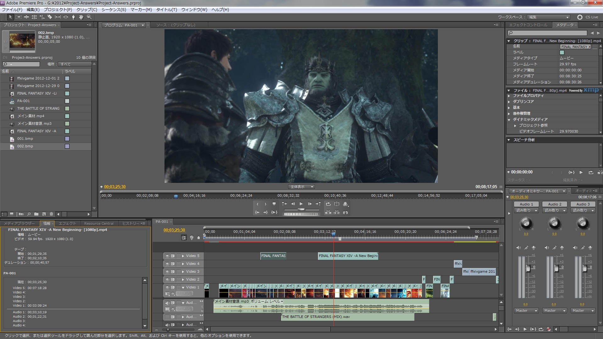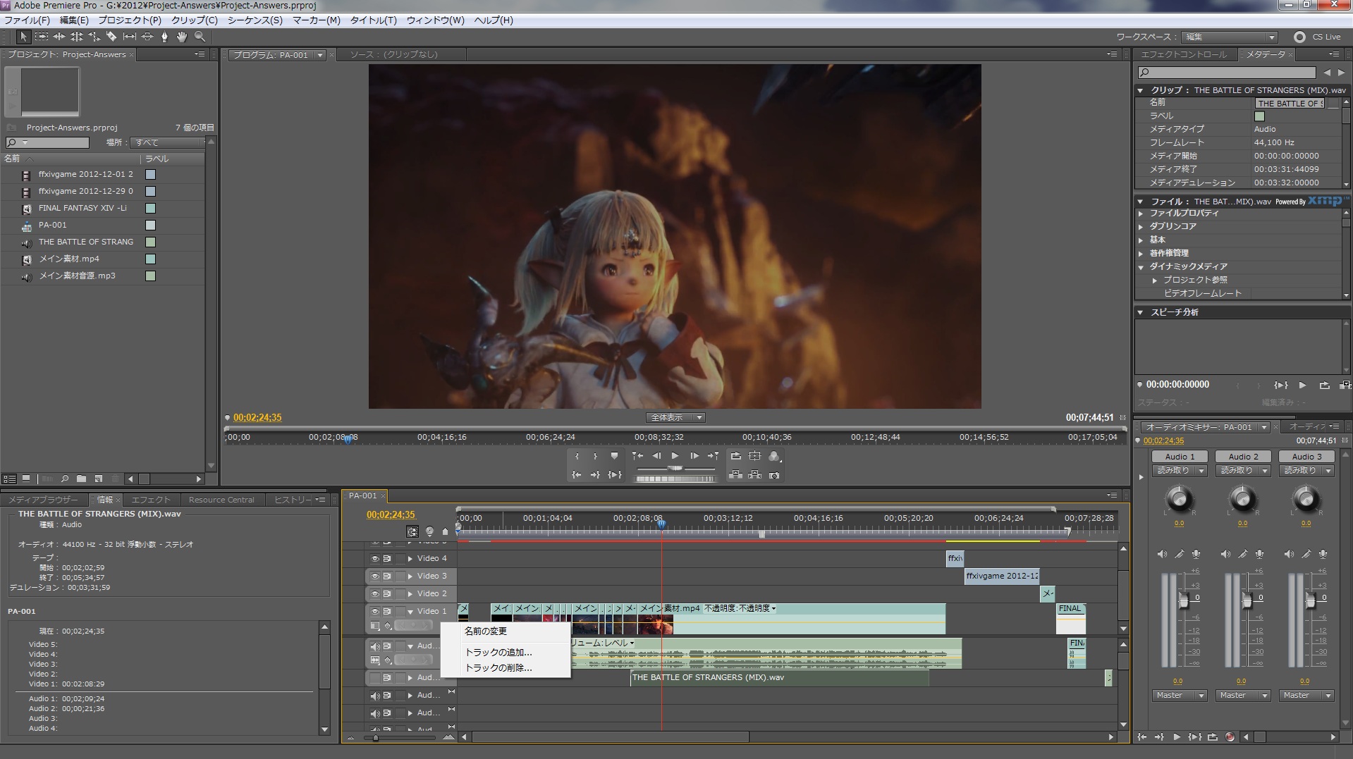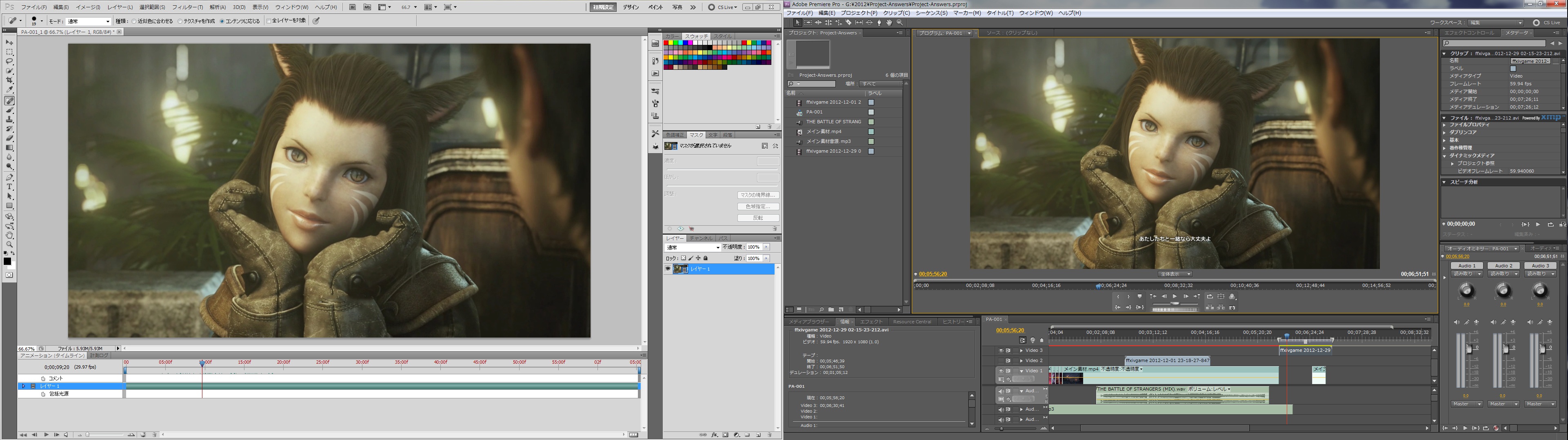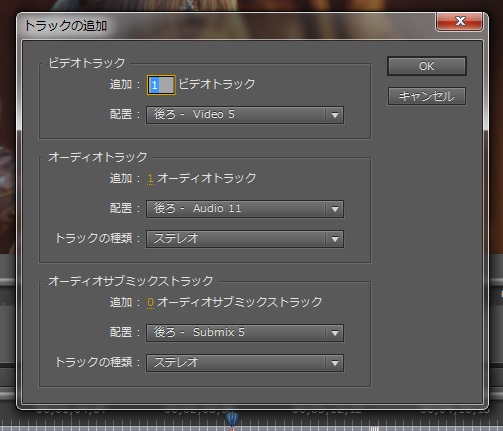 PAGE | 1 2 3 4 5 6 7 | ADMIN | WRITE 2013.01.23 Wed 19:28:24 編集作業-素材動画の編集0062013.01.22 Tue 19:10:25 編集作業-素材動画の編集005先日の記事で文字を消すテストをやってたんですが、動画の流れで行けば消さなくても良くなりましたw ですのでテストはとりあえず中止ということで~、引き続きPremiere Proでの作業に戻ります。 あ~今更なんですけど、私がこうやって映像を分割してるのはちょっとした訳があります。 大した理由じゃないんですが、分割したあとAfter Effects CS5で別の作業をするんですけど、 エフェクトやらなんやらやったあとにレンダリング(書き出し)をするんですよね。 その時にですね、あまりにも大きな映像をレンダリングするとものすっごく時間がかかるんですよ。 まぁその映像の大きさ(時間的な長さ)もそうなんですがエフェクトをバリバリにつかってもそれなりに時間がかかっちゃったりします。 ですので、その時間を少しでも短くしようと思って今回細切れみたいな分割方法で作業しています。 実際どこで映像を切るといいかといえば、シーンとシーンの変り目が一番良いと私は思っています。 なのでなるべくその変り目で分割するように今回は心がけています。 ということで、今回は一切画像はないんですが今まで説明してきた作業をまだ延々と続けていたりします。 内容をチョコチョコ修正したり追加したりしているので素材がかなり増えてきていますww メインになる素材すらまだ終わってないのに追加が結構な数になりそうな感じヽ(;´Д`)ノ そうだ! 言い忘れていた事がw 以前の編集日記で --- 使用する素材がそんなに多くなければトラックを無意味に増やす必要はありません。 ですのである程度素材の数が分かっていればその分だけトラックを増やす。 もしくは同一トラックで後方に素材を置くと良いです。 要らない部分は捨ててしまえばいいですし、最悪切り出し用にプロジェクトをもう一個作ってもいいです。 --- こんな事を言いました。 もちろんこれでも問題なくはないんですが、今回の私のように不意な素材の追加があった場合 どうしてもトラックを増やす必要が出てきたときの為に『トラックを増やす方法』を書いておきます。 やり方は非常に簡単です。 トラックの上でマウスを右クリックするとメニューが出てきます。 んで、『トラックを追加』をクリックすれば このように画面上に追加するトラック、今回はビデオトラックを追加するので 追加の項目でいくつトラックを増やすか、配置でどのトラックの後ろに増やすかを決めてOKを押せばトラックが増えます。 オーディオとオーディオサブも同じようにやれば大丈夫です。 と言う事で今回はここまで。 しかし、この映像のララフェル可愛いよなぁ~(*´ω`*) 2013.01.20 Sun 07:42:34 編集作業-素材動画の編集004 今回ちょっと詳しい説明を省きます。 まだテスト段階ですので、成功しましたら記事として後日掲載します(*´ω`*) とりあえずまずはこの画像から。 左のモニタではPhotoshop CS5 Extendedを起動。 真ん中のモニタはPremiere Pro CS5を起動しているSSです。 で、こんなことして何をしているのかといえば、いらないものを消してる作業中だったりします。 となると私の言う「いらないもの」とは何か。 そう、 『文字』 です。 今映している動画、まったく同じ場所を映しています。 んでこっちが文字を消した状態。 Premiere Proの方はまだ反映してないので文字が出たままですが、ほとんど違和感がないレベルだと思います。 正直よぉ~く見ないと分からないほど。 まぁこんな感じの事をやりつつ書き出して劣化具合を見てみようというのが今回のテストです。 ということで今回はここまで~ヾ(-∀・*) 2013.01.08 Tue 14:40:22 CPUかぁぁぁぁぁ!!! 頭打ちか!! さっきちょこっと動画の確認というかエンコードの設定を色々イジってテストで書き出したんですけど あかんわ・・・所々カクついてるわぁヽ(;´Д`)ノ その上若干の編集ミスしてるしww まぁテストだからいいんだけどさぁ~、しばらく触ってないとホント忘れてるわ。 エンコードの設定も以前はどんな設定にしてたのか忘れてるしというかなんでプリセット保存してないねん、私!ヽ(*`Д´)ノ で、サイズを変更してエンコードの設定も再度イジってみました。 今度はなんとか大丈夫みたいですのでテストバージョンということで公開。 あくまでもエンコードテストなんでやっつけです、動画に別の音源入れただけなんでww PA-001 from Lenge Laevateinn on Vimeo. あと先日BDの『学園黙示録 HIGHSCHOOL OF THE DEAD』を久々観たんですけど、 そういえばこのアニメのEDって全話テーマソング違ったんですよねぇ(*´ω`*) んで、その時の映像が毎回変わっていくというか増えていくんですよね。 この演出はいいなぁ~と改めて思いました。 シンプルですけど個人的は好きな演出ですね(*´ω`*) あ、完成したらこのテストバージョンは消しますのでw 2013.01.07 Mon 12:45:00 今日から私は!!仕事です。