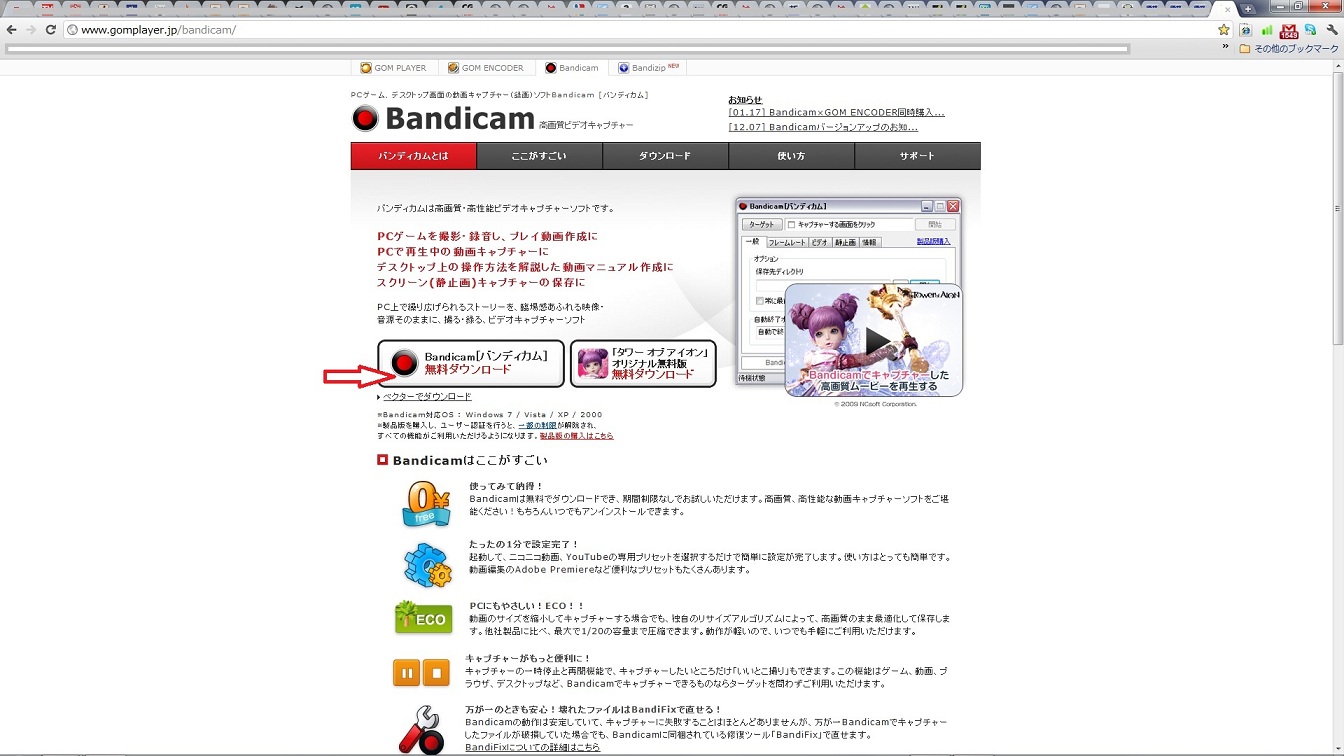 で、次に矢印の部分『Bandicam[バンディカム]無料ダウンロード』をクリック。